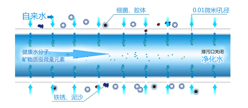 首先我們來了解一下超濾膜的過濾原理,在使用時通常以壓力差作為驅(qū)動力,使進(jìn)水通過膜孔徑,而孔徑通常在0.01微米左右,而比孔徑更大的雜質(zhì)則會被截留在膜表面,能夠有效過濾水中比孔徑大的雜質(zhì),實(shí)現(xiàn)過濾、凈化、分離的效果。大致情況如下圖: